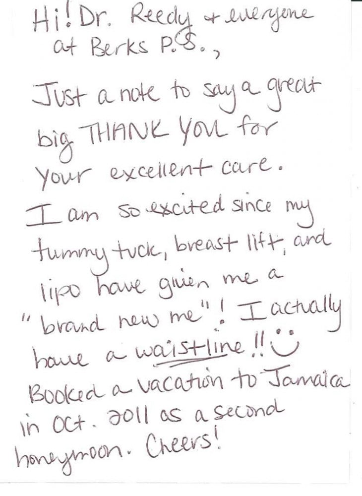 Hi Dr. Reedy & everyone at Berks Plastic Surgery,