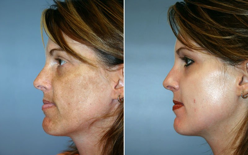 This 36-year-old mother was concerned with the excessive pigmentation of her skin which was a melasma that occurred as a result of hormonal changes during pregnancy. The patient had tried various over the counter products over a four year period to no avail. After consulting with both Dr. Reedy and our aesthetician, Donna Erb, she was placed on the Obagi system. The patient used the pre-peel Obagi products in preparation for the peel, and saw fantastic results with that alone. After undergoing the Blue Peel she went from having the freckled mottled complexion to a perfect porcelain-like complexion.